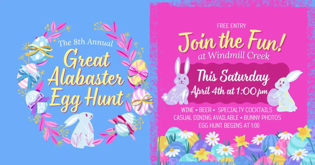 Join us for our 8th Annual Great Alabaster Egg Hunt at Windmill Creek beginning at 1:00 PM.